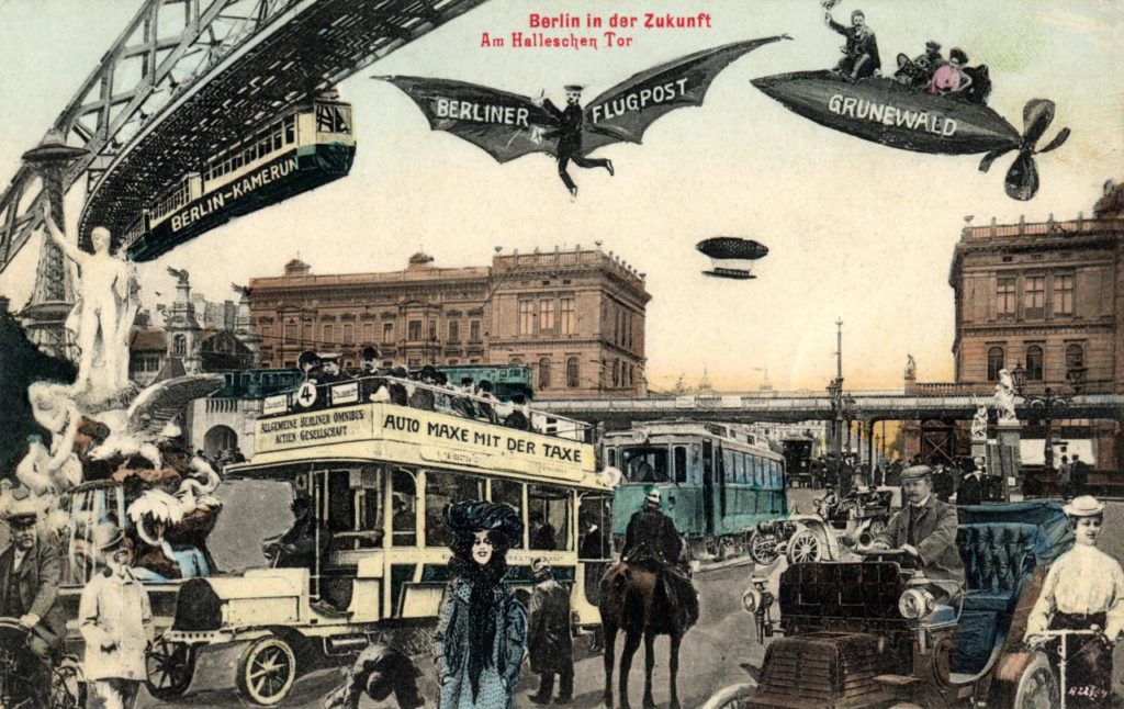 Dem Jahr 2000 aus der Sicht des 19. Jahrhunderts verschrieben sich Zeichner und Karikaturisten. Ihre futuristischen Zeichnungen waren beliebte Sammelbilder, die als Papierkarten in Zigaretten- oder Schokoladenpackungen in Umlauf gebracht wurden. Bei der Umsetzung utopischer Fantasien war die Fotomontage ein beliebtes Verfahren. Auf humoristische Weise zeigen einige der Ansichtskarten und Postkartenmotive überflutete Städte wie „Wenn Paris am Meer wäre“ oder „Ein Ausflug in der Zukunft“. Vieles, was die Menschen von der Zukunft erwarteten, ist bis heute nicht eingetreten. Zu große Hoffnungen setzte man beispielsweise in Stickstoffdünger: Turmhohe Kohlköpfe und tonnenschwere Kartoffeln würden den Jahresbedarf einer vielköpfigen Familie decken, so glaubte man damals.
