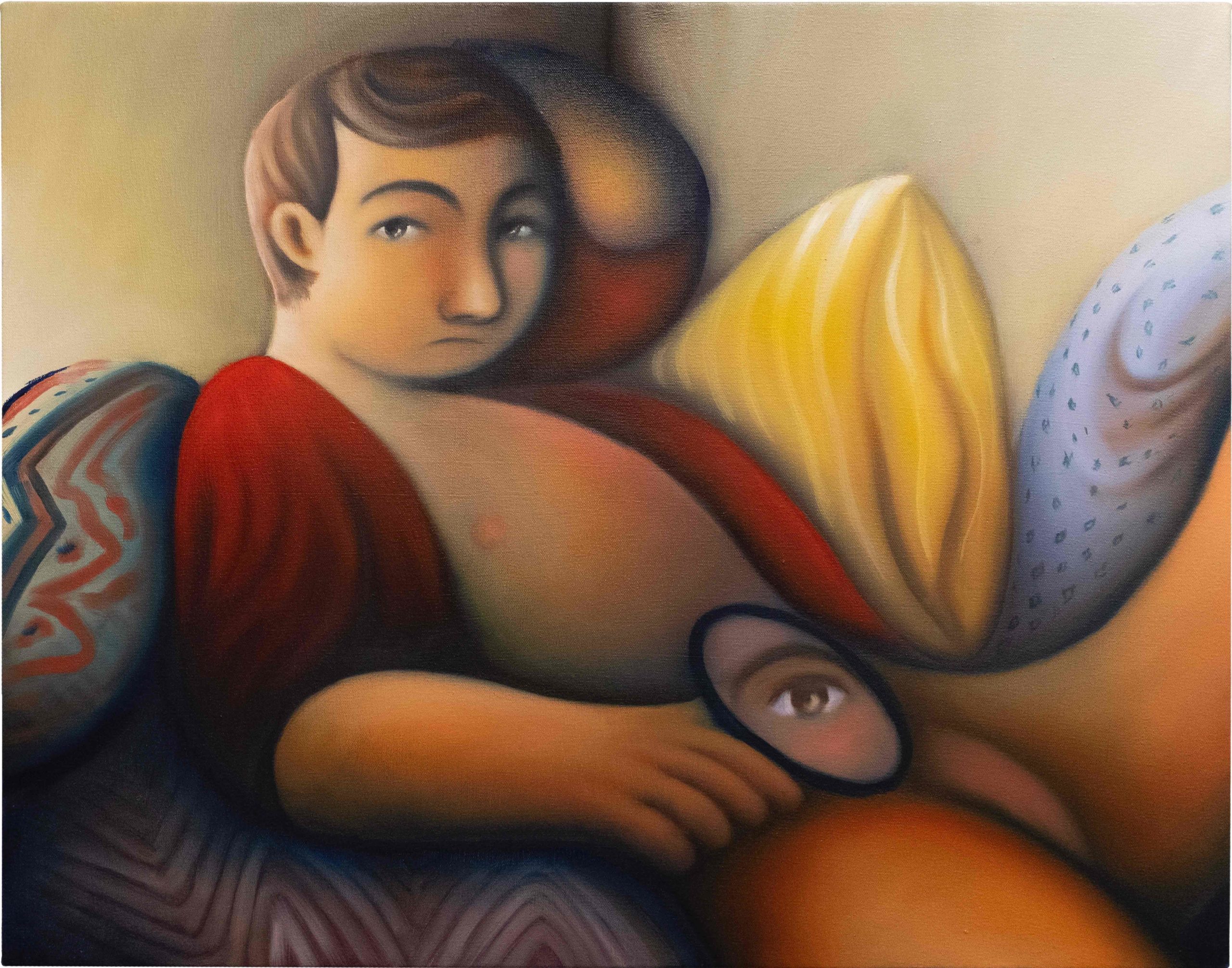 The central theme of Justin O’Brien’s works is not so much the nearness between lovers, the theatre of affections with which Eros inflicted us—hopeless expectation, calculated indifference, confident vanity, desire—, as the sphere in which these sentiments develop. Confined in a suburban house, compressed in a smoky bar, late at night, lost in the indistinct curvy zone of deep human connection, the lovers seem trapped inside very distinctive places. Nonetheless, it is there, in the concrete counterpart of their dreamy beings, that life unfolds, dancing in a blue rug, engulfed by an armchair, posing in a chaise longue.