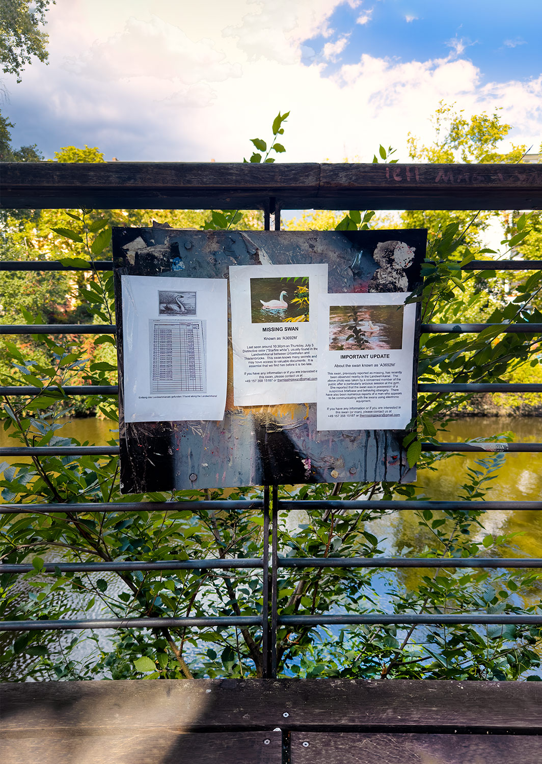Im Laufe mehrerer Wochen wuchs und veränderte sich die Geschichte des Schwans – durch eine immer größere Anzahl öffentlich angebrachter Materialien, Sprachnachrichten, Audioinstallationen, Live-Performances und maßgeschneiderte Interaktionen mit einzelnen Personen. Das Projekt, das noch bis zum 11. August läuft, erstreckt sich über einen Abschnitt des Landwehrkanals zwischen Urbanhafen und Thielenbrücke.
