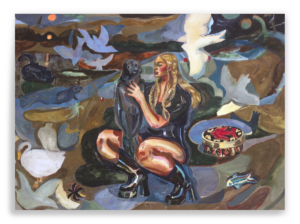 Rebecca Harpers Bilder entfalten sich langsam: Eine Frau im Zentrum, Wasser trägt, Spiegel öffnen Räume. Zeichen, Fische, Vögel – ein Echo.