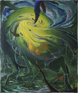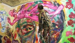 Mit einer neuen Soloausstellung und Malaktion kommt der Friedenauer Maler Schlangenbader nach Schöneberg und stellt dort sein farbintensives Maluniversums mit der Live-Erschaffung eines Kunstwerk vor Ort als 17 x 3 m großes Aktionsbilds im mz project room maia zinc aus.