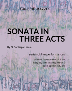 Galerie Mazzoli is pleased to invite you to the performance "Sonata In Three Acts" by N. Santiago Lazala, which will take place every day at 8 pm starting Thursday, February 27th until Saturday, March 1st.