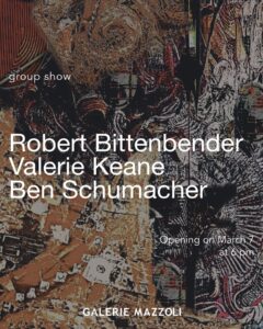 Show with Robert Bittenbender, Valerie Keane, Ben Schumacher opening on Friday March 7, at 6 pm.