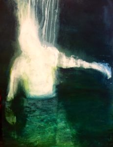 Rebecca Harpers Bilder entfalten sich langsam: Eine Frau im Zentrum, Wasser trägt, Spiegel öffnen Räume. Zeichen, Fische, Vögel – ein Echo.