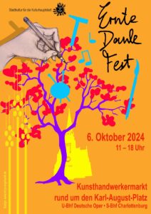 Zum Erntedank verwandelt sich der Karl-August-Platz in Berlin-Charlottenburg wieder in eine quirlige Kunst-, Kultur- und Genussmeile. Über 70 Kunstschaffende präsentieren ihre kreativen Design-, Handwerk- und Kunst-Objekte rund um die Trinitatiskirche.