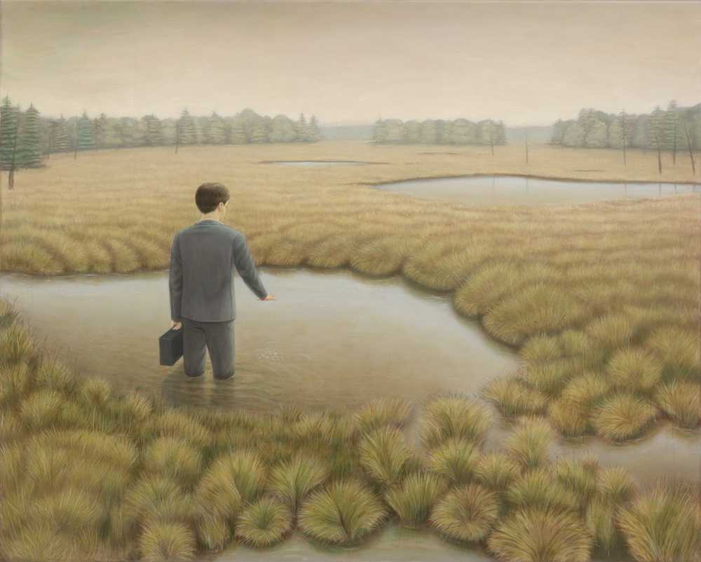 Leif Borges Gemälde zeigen einsame Individuen, die in einer ganz eigenen Wirklichkeit interagieren und lässt damit eine Nähe zum Surrealismus erkennen.