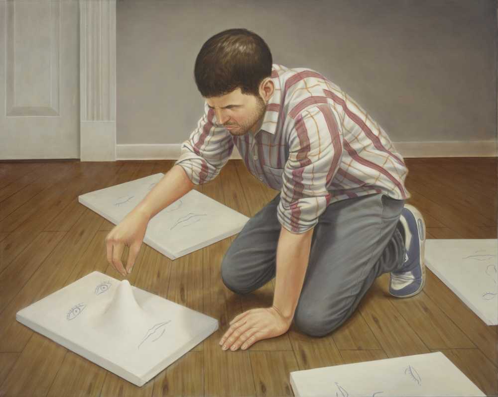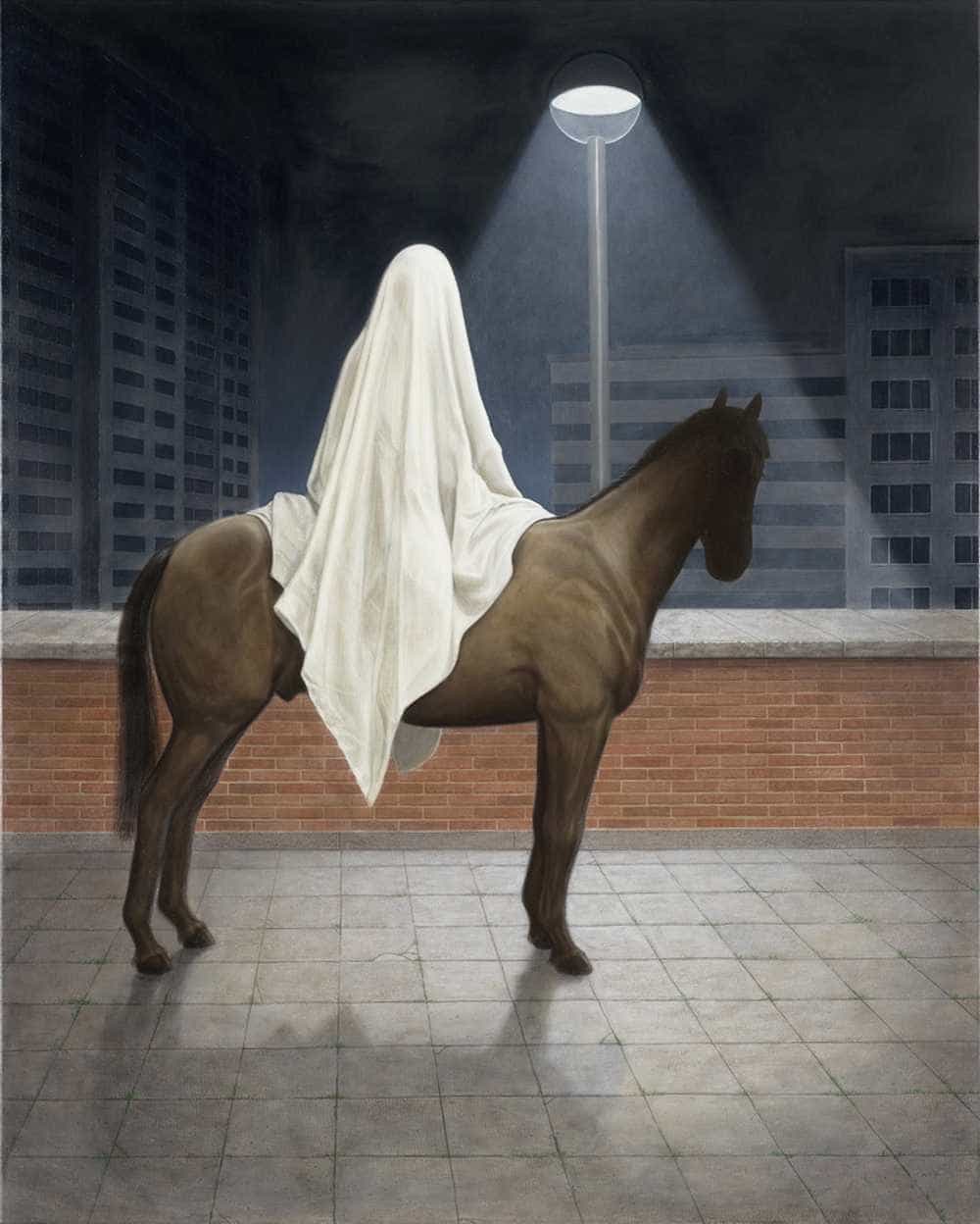 Das Gemälde Troja zum Beispiel zeigt ein unter einer Laterne stehendes Pferd, der Reiter ist komplett mit einem weißen Tuch verdeckt, es wird jedoch nicht eindeutig klar, was sich genau unter dem Tuch befindet. In einem anderen Gemälde mit dem Titel Lehrstündchen entfaltet sich vor einer idyllischen Bergkulisse die skurrile Szene um eine ausgestreckte lebensgroße Barbiepuppe.