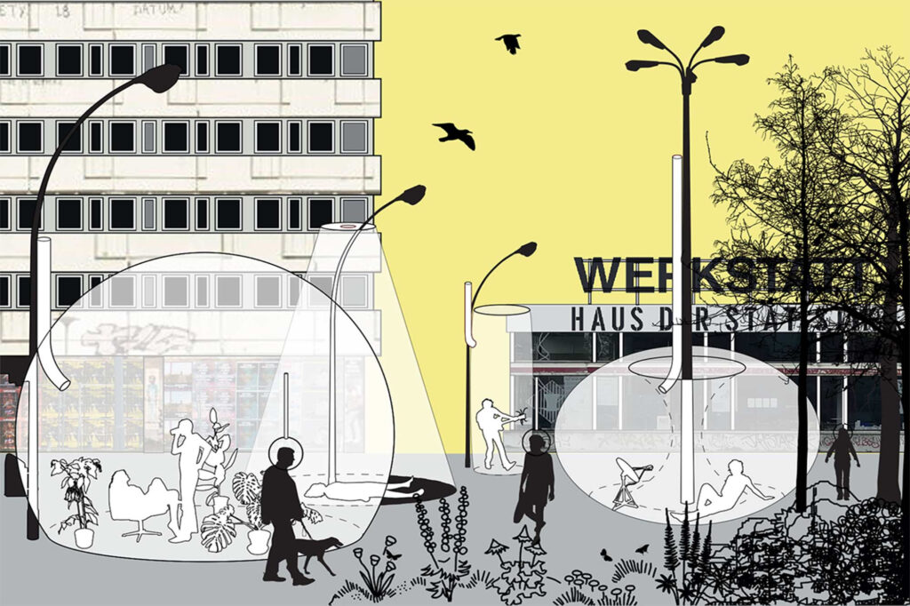 Die Künstler*innen reflektieren dabei aktuelle gesellschaftspolitische Tendenzen und entwerfen dystopisch bis optimistisch Visionen unserer Zukunft.