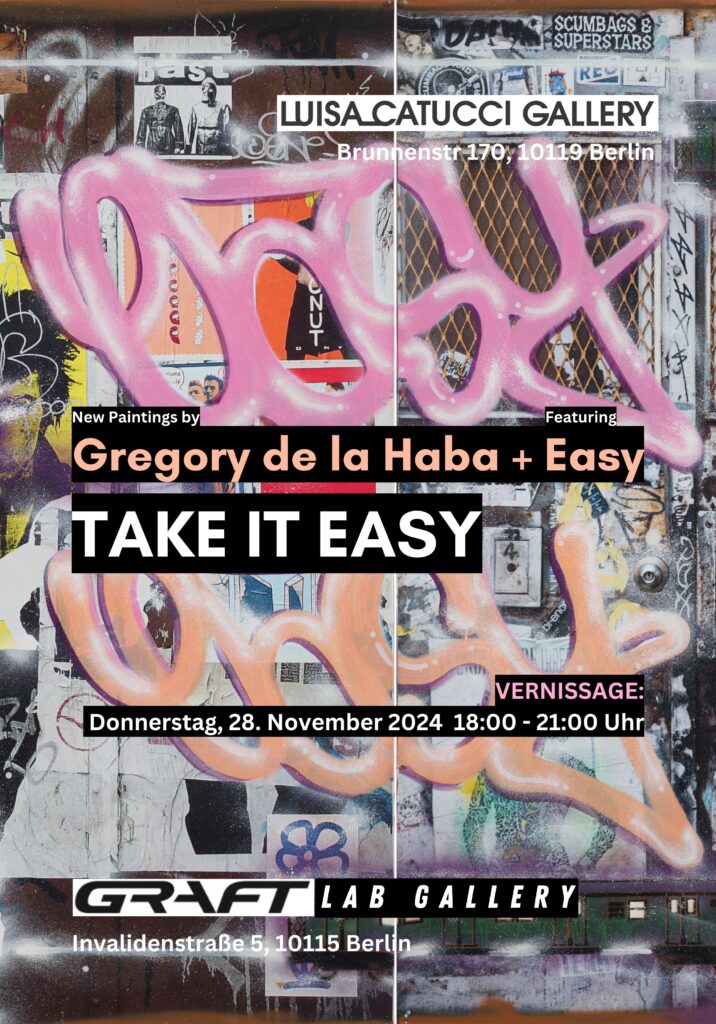 Take It Easy showcases the latest paintings by the New York-based, multidisciplinary artist, Gregory de la Haba, featuring the prominent graffiti writer, Easy. Curated by Luisa Catucci, owner and director of the eponymous gallery in Berlin.