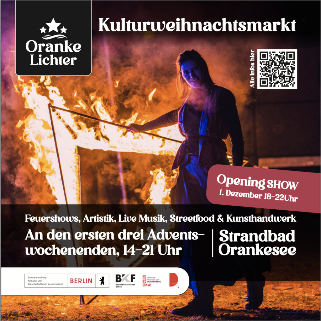 Der ORANKELICHTER Kulturweihnachtsmarkt startet zum dritten Mal am schönsten See Lichtenbergs. Das Strandbad Orankesee wird in einen magischen Ort voller Kultur und festlicher Stimmung verwandelt.