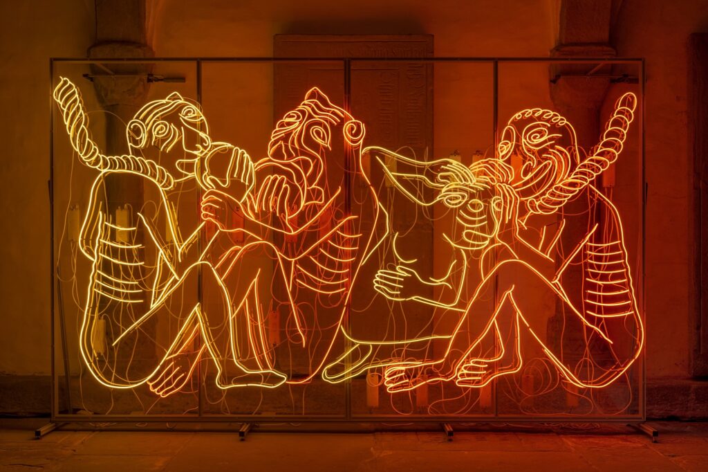 In „Medieval Neon“ präsentiert die Galerie Thomas Schulte in ihrem Corner Space und dem danebenliegenden Galerieraum zwei raumgreifende Lichtinstallationen von Bethan Huws.